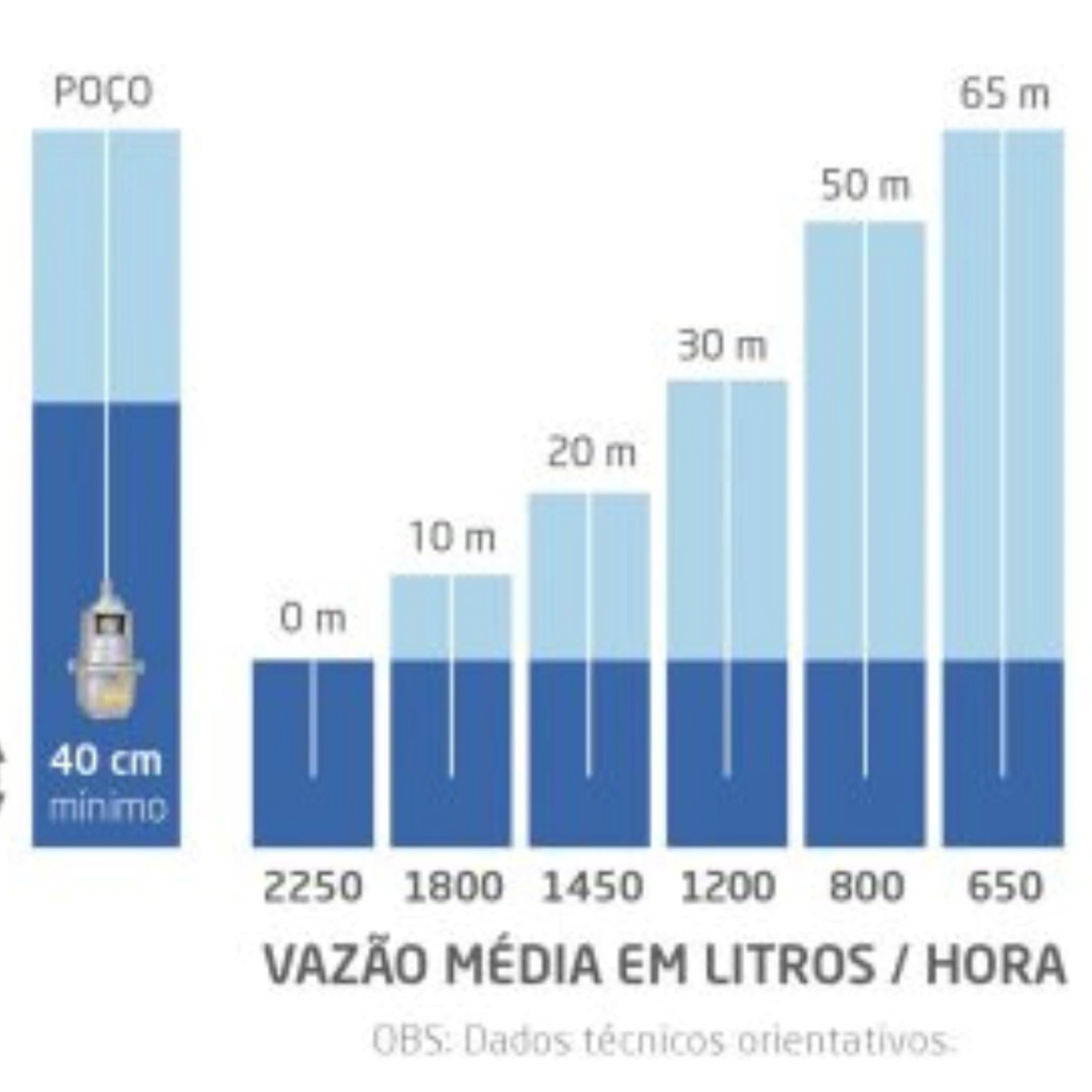 - Vazão mínima: 650 L/h para 65 mca;